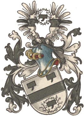 Wappen: Im Schild ein Querbalken, darüber 2, darunter 1 rechteckiger Stein; auf dem Helm